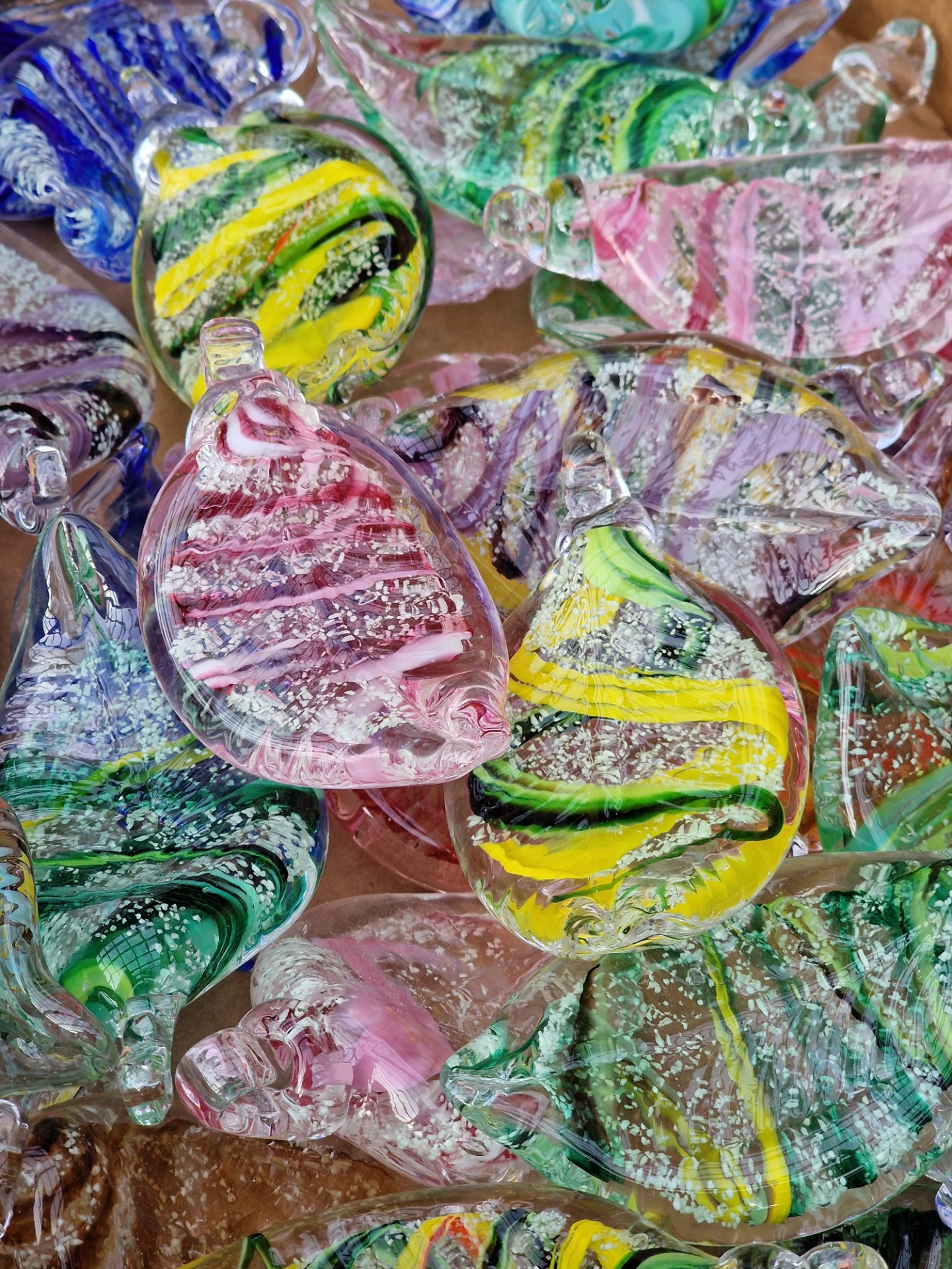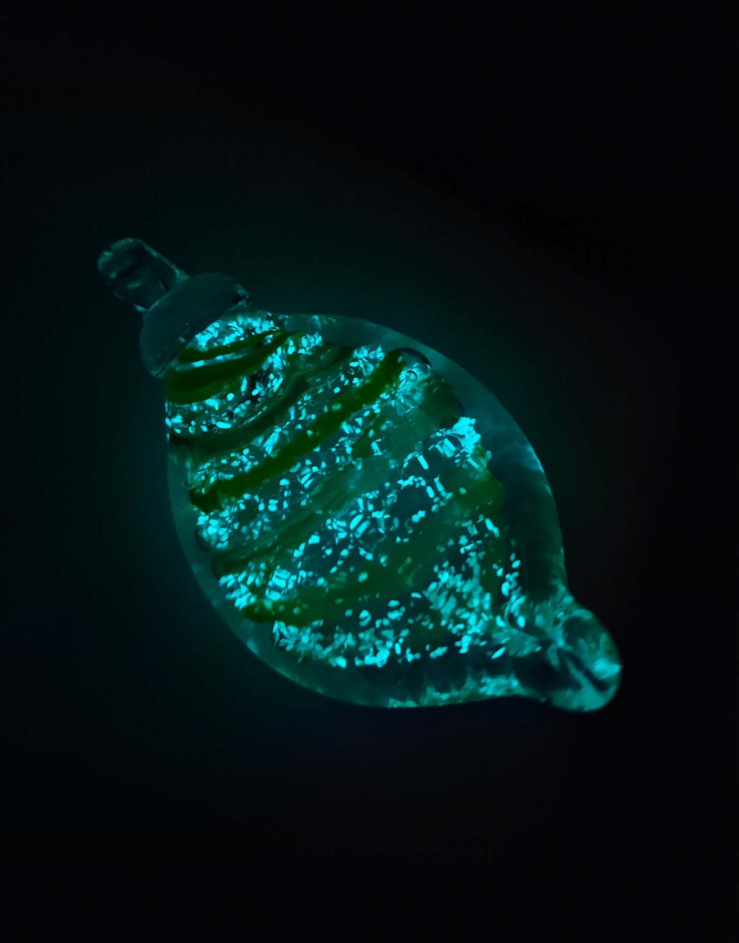 Uvnitř skla je jemně zapracovaný UV pigment, díky němuž list ve tmě magicky září modrým světlem. Barevnou strukturu doplňují roztavené skleněné střípky, které vytvářejí jedinečný vzor – žádné dva kusy nejsou stejné.